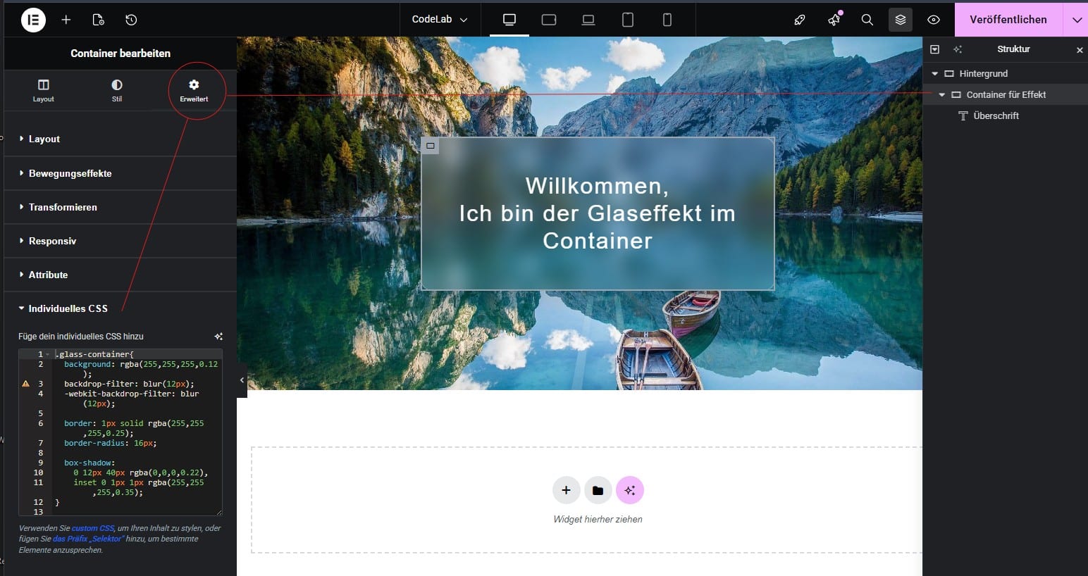 Zuerst erstellt ihr in Elementor die gewünschte Container-Struktur. Dazu fügt ihr einen neuen Container ein und platziert darin euren Inhalt, zum Beispiel eine Überschrift oder Text. Anschließend klickt ihr den Container an, öffnet den Tab „Erweitert“ und scrollt nach unten zum Bereich „Individuelles CSS“. Dort fügt ihr den kompletten CSS-Code für den Glass-Effekt ein.