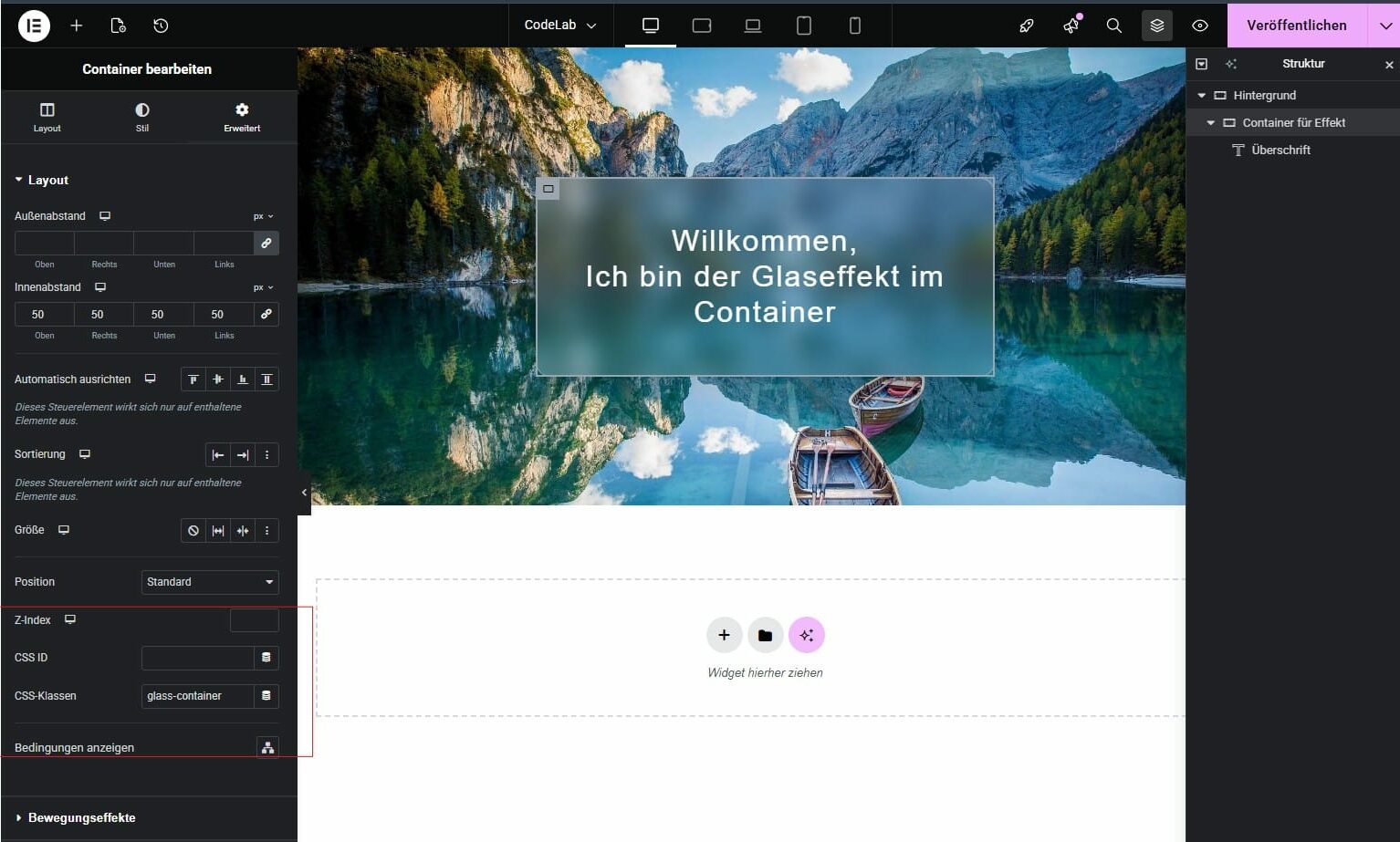 Im zweiten Schritt bleibt ihr weiterhin im selben Container unter „Erweitert“. Etwas weiter oben befindet sich das Feld „CSS-Klassen“. Hier tragt ihr zusätzlich den Namen glass-container ein. Wichtig ist, dass ihr die Klasse ohne Punkt und ohne Sonderzeichen eingebt. Nachdem ihr gespeichert habt, wird der Glas-Effekt auf diesen Container angewendet.